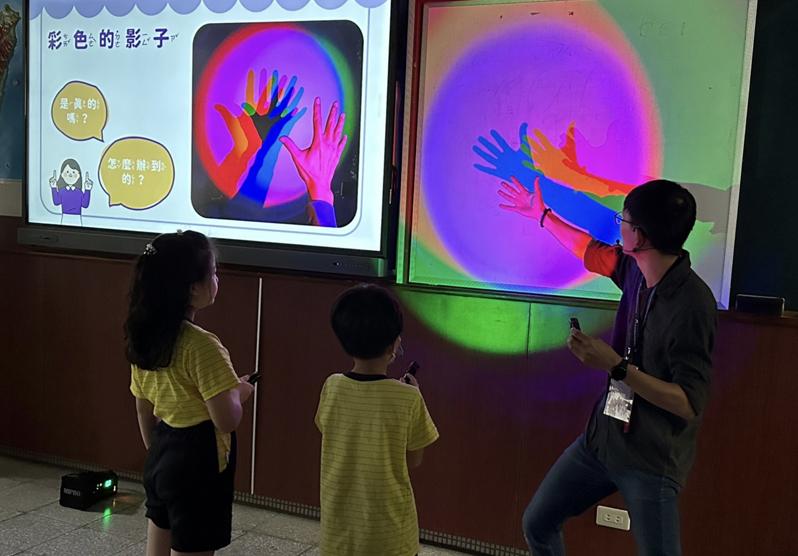 最好玩就是那個照光影,BenQ的字照手電筒如果轉換的話它就會變色,然後白色的光只會變黑色的影子,照不同的光中間的字會變成很多的顏色,很好玩,第一次玩影子課程。