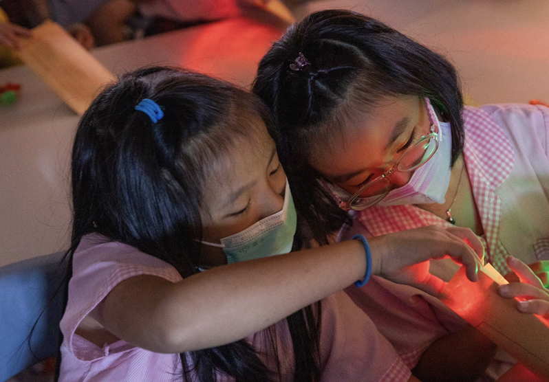 透過光可以看到彩虹,回家會跟爸媽分享,教姐姐認玩三原色的遊戲。